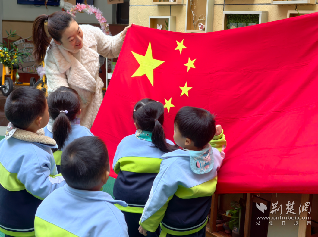 对于小班无知的孩子来说,教育是从最直观的民族符号开始的。活动中,老师们用生动有趣的动画和彩色旗帜引导孩子们了解红色遗产和旗帜五星级图案的深层含义。 “国旗是我们国家的象征。爱国旗就是爱我们的国家”:老师的亲切话语和孩子们对国旗的温柔触摸,将爱国主义转化为具体可感知的早期体验,在孩子们的心中播下了尊重和热爱的种子。