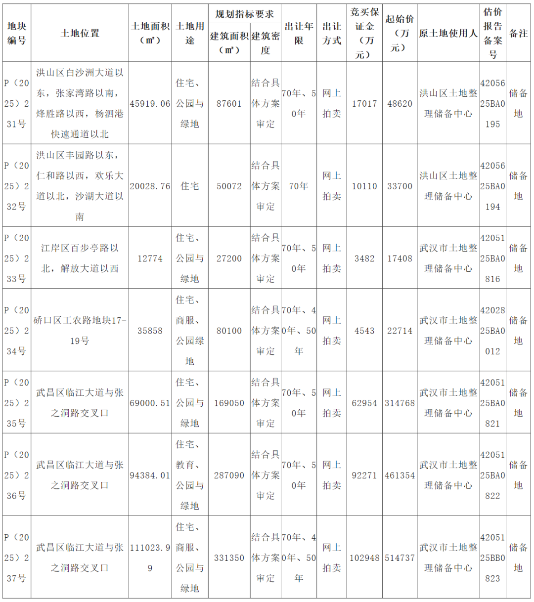 12月4日,武汉市自然资源和城乡建设局发布《关于拍卖转让武汉市国有建设用地使用权的公告》(武高字〔2025〕31号),挂牌了7块住宅用地,其中洪山区2块、江岸区2块。桥古区1号地块、武昌区3号地块,总用地面积38.9万平方米,规划总建筑面积103.25万平方米,总起售价1413.3万元。此次公布的土地定于12月25日进行拍卖。