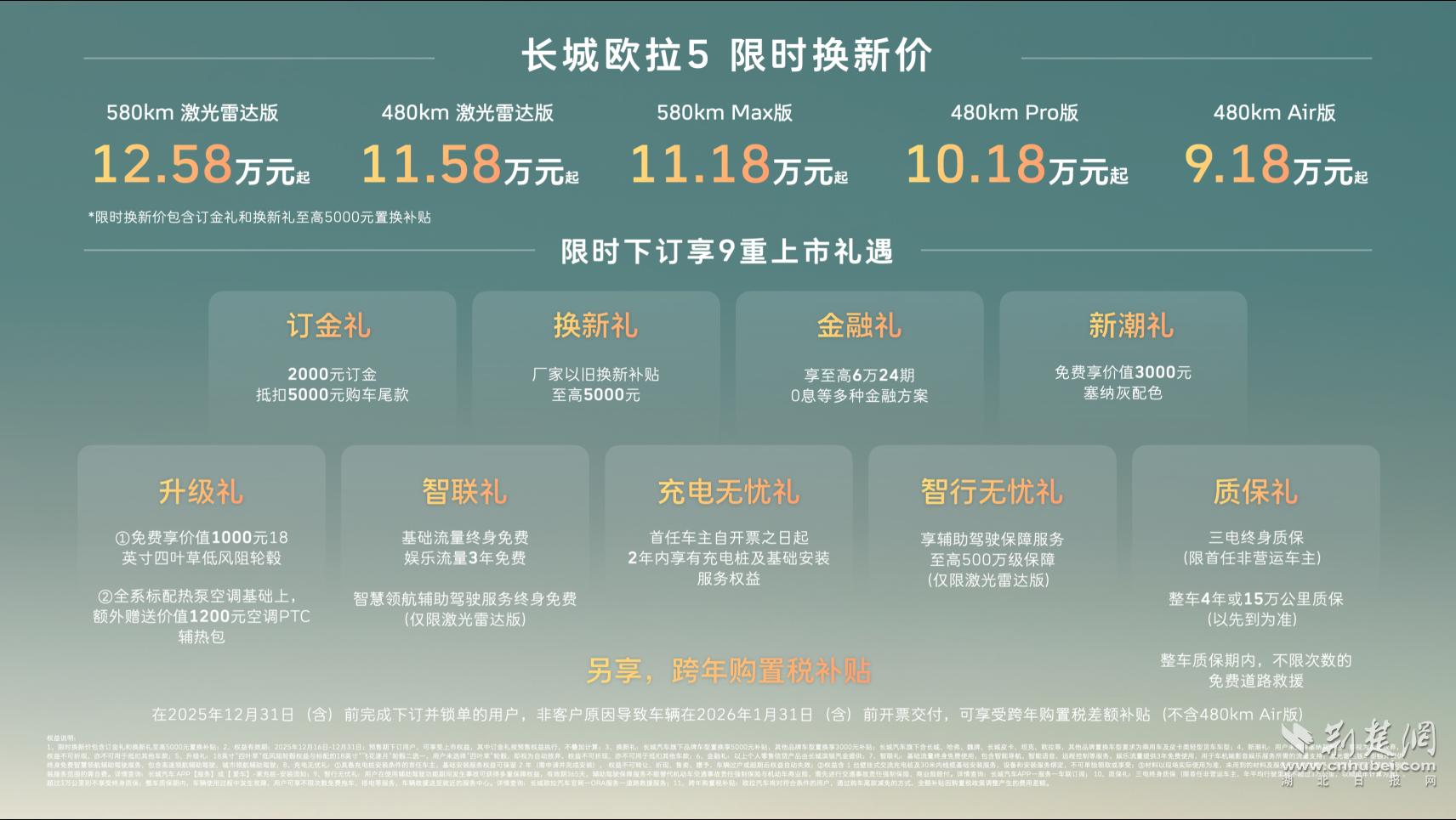 12月16日,长城汽车全新A级欧拉纯电动SUV长城欧拉5正式上市。共推出五款新车型,建议零售价为9.98万元至13.38万元。限时兑换价格91800元起(限时兑换价格包含“充值礼物”和“兑换礼物”以及最高5000元的兑换补贴)。为回应广大用户的厚爱和支持,即日起至2025年12月31日,下单并屏蔽的用户将享受9项介绍礼物,包括存款礼物、交换礼物、无忧智能出行礼物,以及除夕购车税收补贴(不含480公里航空版)等丰厚的购车权益。长城欧拉5致力于以诚实的定价权和产品卓越的坚固性成为全球年轻用户的“首选合作伙伴”。